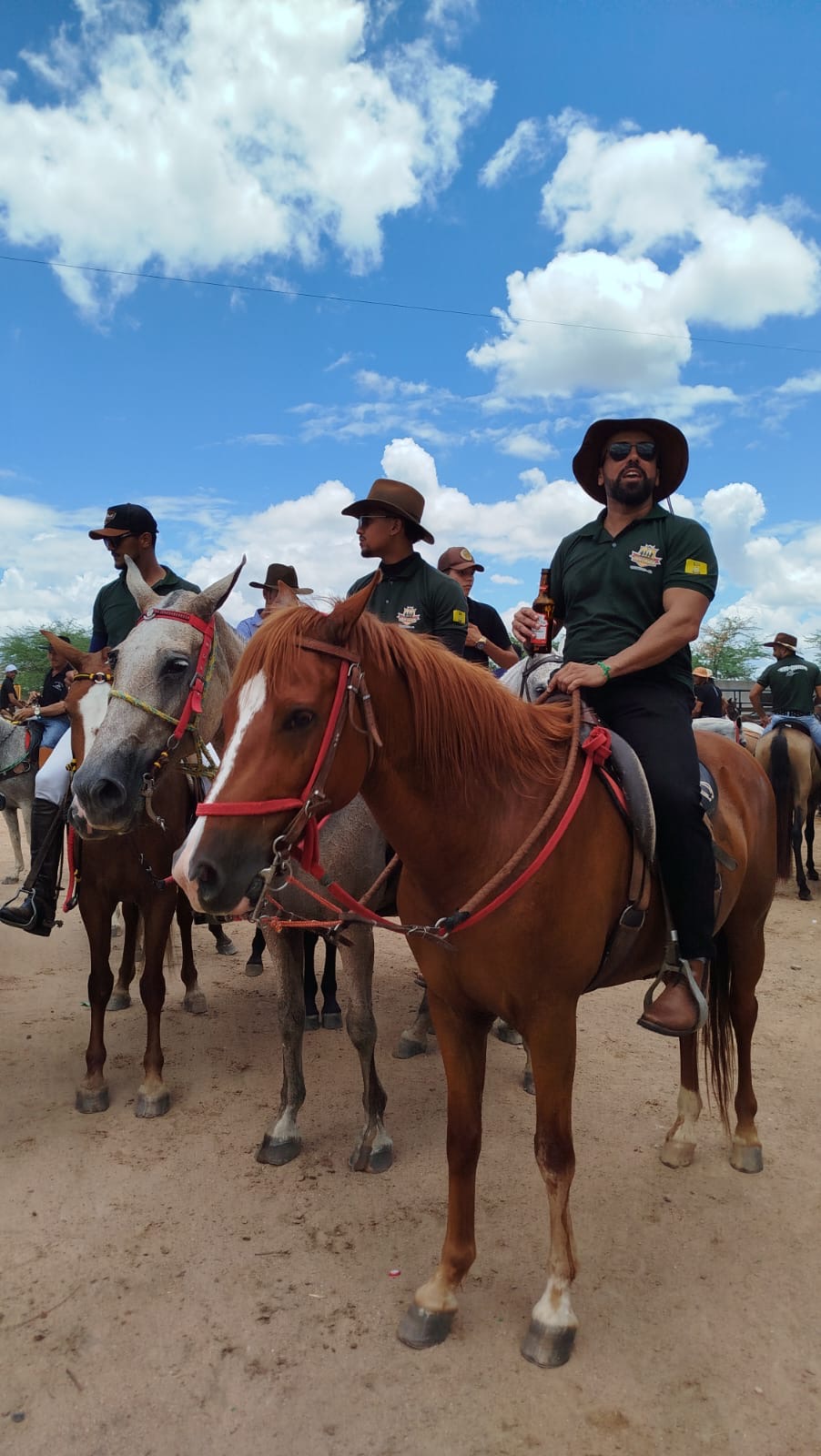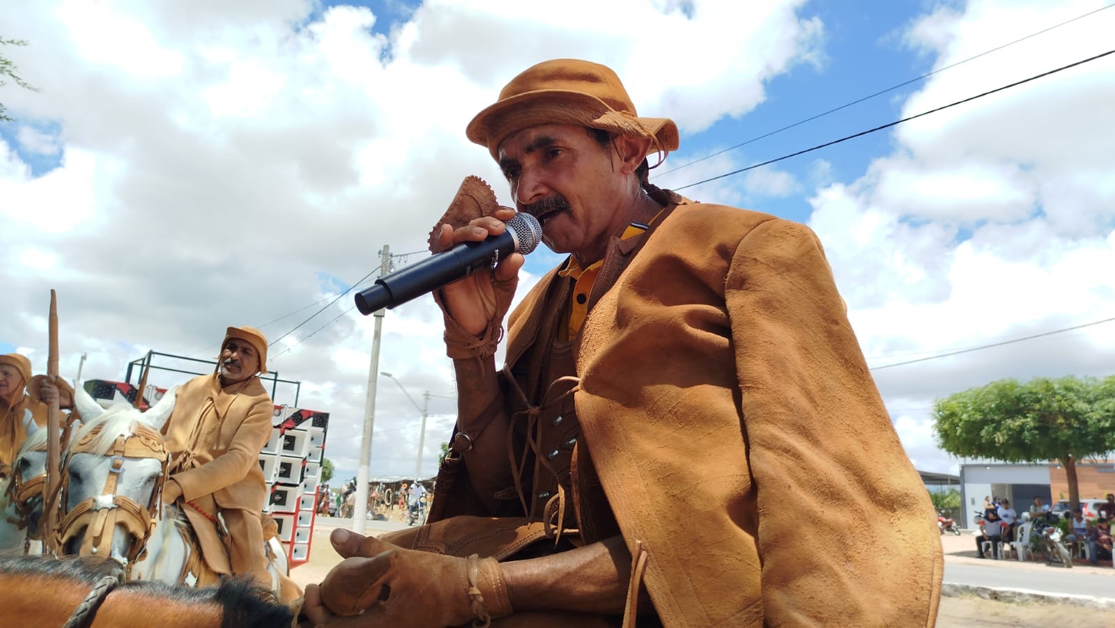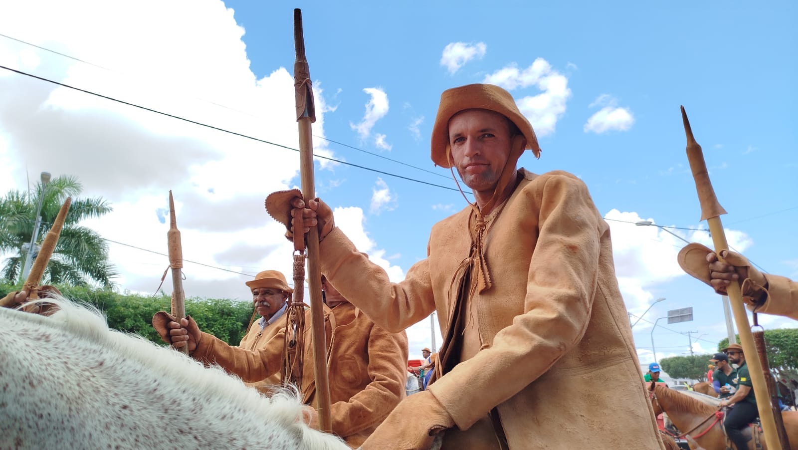 Os vaqueiros chegaram montados nos seus cavalos, vestidos de gibão, botas, coletes e chapéu de couro, trazendo no semblante a bravura do homem.