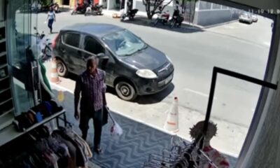 As imagens mostram que o suspeito passa pela rua, observa o produto, mas não leva. Poucos segundos depois, ele retorna e comete o crime.