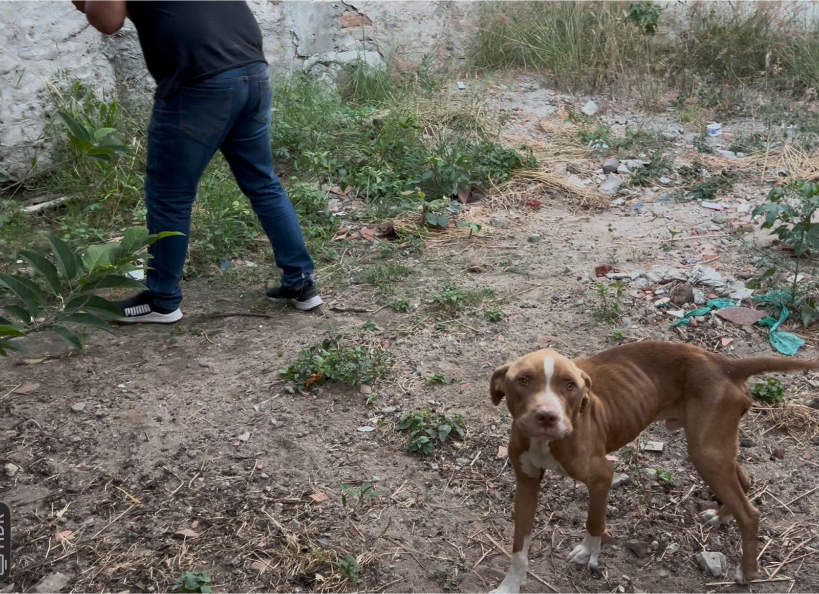 O cão foi resgatado e encaminhado aos cuidados adequados. Ele já foi alimentado.