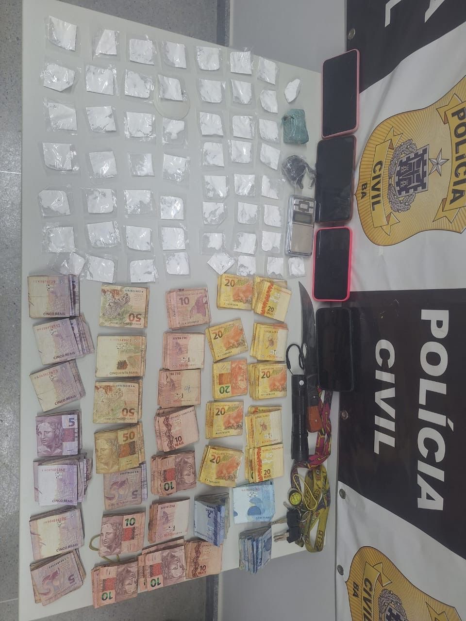 Na mesma ação, a Polícia Civil de Cansanção buscou ainda por outros dois homens, que conseguiram escapar. Na casa de E.S.L foram apreendidos tabletes de maconha, 196 papelotes de cocaína, balanças de precisão e uma motocicleta.