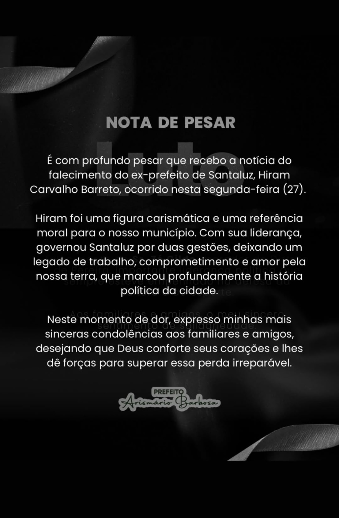 “Hiram foi uma figura carismática e uma referência moral para o nosso município. Com sua liderança, governou Santaluz por duas gestões, deixando um legado de trabalho, comprometimento e amor pela nossa terra, que marcou profundamente a história política da cidade”, pontuou o prefeito.