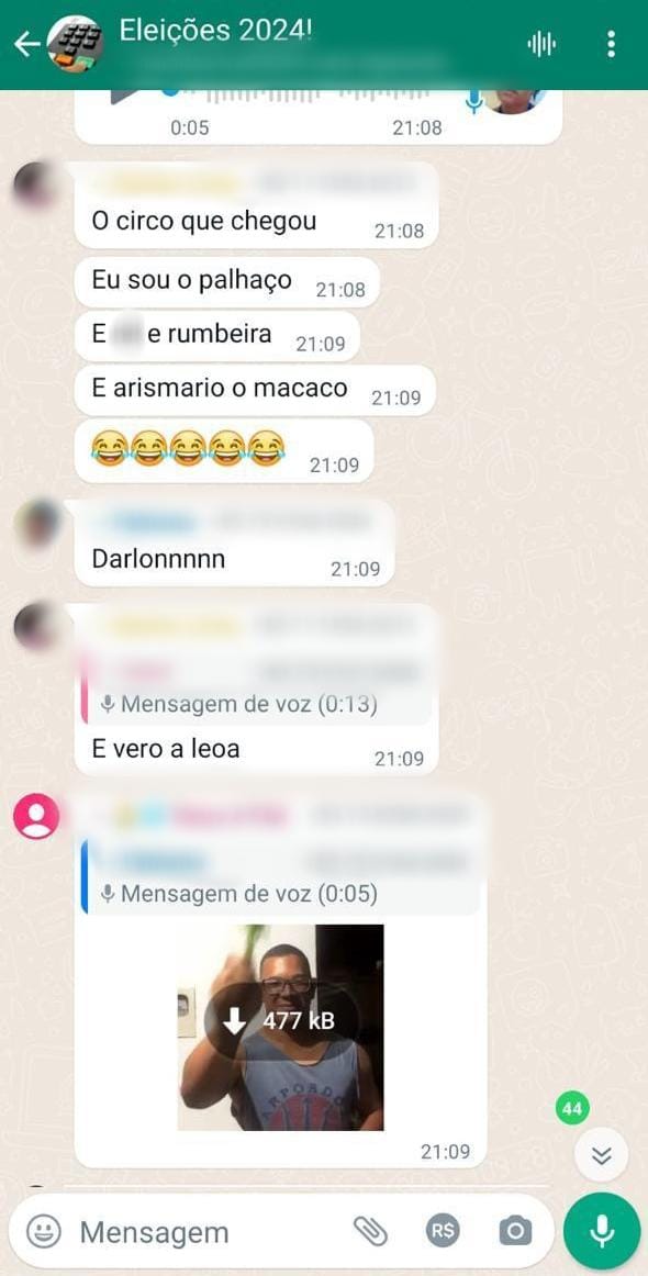 As injúrias foram enviadas em um grupo de conversas no aplicativo do WhatsApp. Em um print, Darlon Lima, autor do crime, compara o prefeito a um macaco.